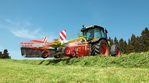 Per aziende con trattori piccoli, CLAAS propone il LINER 450 T, una versione trainata ad alte prestazioni. Questo modello segue perfettamente il trattore anche su terreni in pendenza, indipendentemente dal tipo di attacco (barra di traino fissa o barra oscillante).